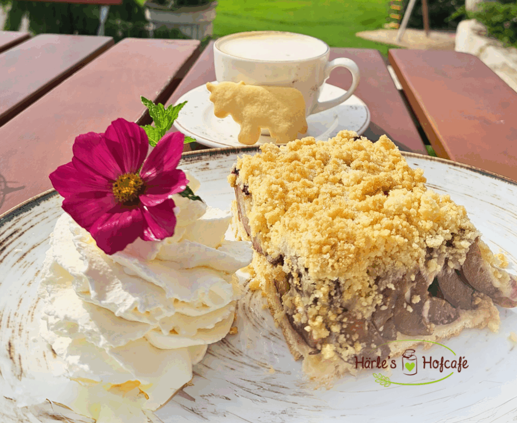 Bei schönem Wetter servieren wir euch den Zwetschgenkuchen auf der Terrasse – mit Sahnehäubchen, Blüten-Deko und bester Sicht auf die sanften Hügel rund um Laubbach. Dazu passt perfekt: ein Cappuccino mit Butterkeks in Kuhform 🐄 – typisch Härle’s eben.